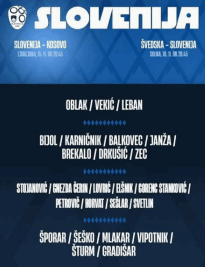 Kombëtarja e Sllovenisë të martën ka publikuar listën e futbollistëve të ftuar për dy ndeshjet e radhës kualifikuese për Kampionatin Botëror, ku do të përballet me Kosovën dhe Suedinë.